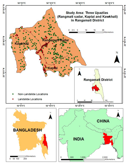 Rangamati, a hilly southeastern district of Bangladesh is selected as the study area because of the regular landslide occurrences in this area. More than 100 people died, and 12,000 families suffered losses due to landslides in this district [38]. Most landslides in Rangamati take place in three upazilas (sub-districts): Rangamati Sadar, Kaptai, and Kawkhali [35]. As such, the study area is narrowed down to these three Upazilas (Figure 1). The combined geographical area of these three sub-districts is 1145 km2 and more than 40% of it is forested [39]. The geology of this area comprises Dhihing, Dupi tila, Girujan clay, Bhuban, Bokabil, and Tipam sandstone (Figure A3f of Appendix C)). The bedrock and soil structure of the areas are not stable, which makes the hills highly prone to landslides [40]. Climatologically, this area falls under a tropical monsoon climate, and the annual average temperature varies from a maximum of 36.5 degrees to a minimum of 12.5 degrees Celsius, and annual rainfall is 2673 mm with mean humidity level 71.6% [39].