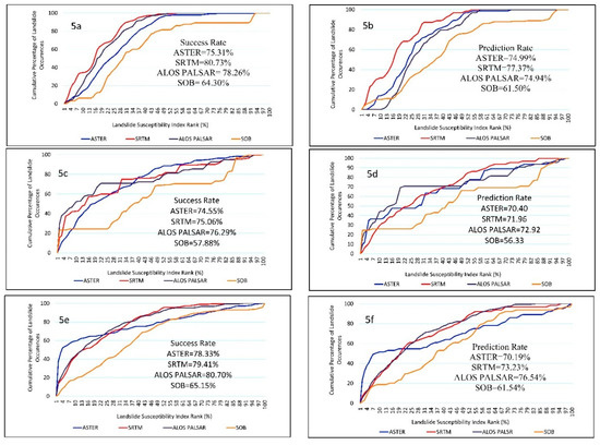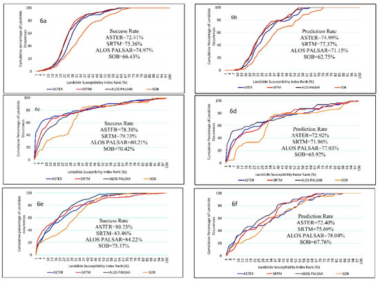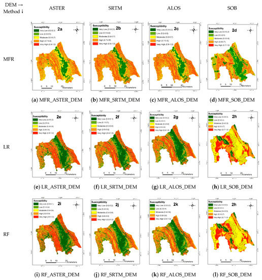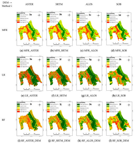 We produced Landslide Susceptibility Indices (LSIs) of the four MFR models using Equation (6) for DEM-based causal factors. The LSI of MFR_ASTER_DEM ranged from 994.6 to 8388.1. The LSIs for MFR_SRTM_DEM LSIs for MFR_SRTM_DEM; MFR_ALOS_DEM and MFR_SOB_DEM ranged from 591.4 to 9458.8 and 527.8 to 10056.5 and 638.8 to 6130.0, respectively. LSI does not have a unit. It is the product of relative frequency and prediction rate Equation (6), and both of these do not have units. The greater the LSI, the greater is the landslide susceptibility, and the smaller the LSI value, the lower is the susceptibility [35,44]. The ranges of LSIs indicate that MFR_SRTM_DEM and MFR_ALOS_DEM models had a comparatively broader range than the rest of the two models. This happened because of the variable FR and PR values. For ASTER DEM, the highest PR value was for plan curvature, while for other DEMs it was for profile curvature (see Table A1 of Appendix D). For all DEM-based factors, SOB had the lowest PRs among the four models and therefore it affected the LSIs. Later, we used the same Equation (6) to produce four MFR models based on 15 causal factors. The LSI of MFR_ASTER DEM ranged from 1613.00 to 20370.10. The LSIs for MFR_SRTM, MFR_ALOS, and SOB DEMs ranged from 1314.40 to 22300.34 and 1234.95 to 22180.24 and 1995.7 to 17316.9, respectively. The LSIs of MFR_SRTM and MFR_ALOS DEMs have a comparatively broader range than the rest of the two models. The highest PR value for ASTER was 6.25 and for SOB, it was 5.64 (Table A1 of Appendix D) for distance to the road network, while for SRTM and ALOS PALSAR, it was 6.61 and 6.38, respectively. For other causal factors (Table A1 of Appendix D), SOB had the lowest PRs among the four, and therefore LSI was the lowest. As mentioned earlier, the FR values varied for seven topographic factors derived from four different DEMs, and these factors had impacts on the PR of eight common factors. Ultimately these variations defined the LSI of the susceptibility maps.