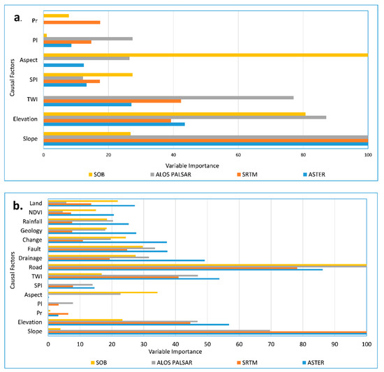 The class-wise FR values of the eight factors that are not derived from the DEMs are generally similar; however, the PR values are different (see Table A1 of Appendix D). The causal factors derived from the DEMs played a crucial role in determining the PR values for these eight factors. For ASTER (0.141), SRTM (0.134), and ALOS PALSAR (0.139), the lowest difference was between the maximum and minimum relative frequency of aspect. While for SOB (0.160), it was SPI. Since these values are slightly different, it affected the PR values.