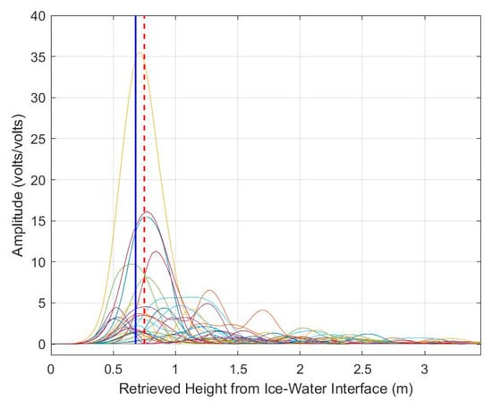 where A(e), H, and denote amplitude, antenna height and phase shift, respectively. The carrier wavelength is represented by λ, which is 19 cm for GNSS L1 band. Next, the frequency (4πH/λ) is estimated using univariate LS-HE as suggested in [13] to retrieve the antenna height from the reflective surface. The periodogram presented in Figure 1 is the output of the LS-HE method where the major peaks represent the distance between the antenna phase centre and the ice–water interface. Readers are referred to [9] for further details on the approach. This example of frequency waveform was obtained from the SNR time series recorded by the GNSS receiver at Waite Lake (Site ID 6; see Table 1) with dominant peaks related to the vertical distance between the antenna phase centre and the reflecting surface. Since the GNSS antenna is installed on the ice surface, the antenna phase centre height (i.e., the distance between the antenna phase centre and the ice–water interface) shown by the waveform is used to estimate total ice thickness. However, because the antenna phase centre is located above the ice surface, an offset must be applied to obtain the distance between the ice surface and ice–water interface. For this example, an antenna phase centre height of 0.75 m was retrieved. After applying the offset, ice thickness was determined to be 0.68 m, while the manual field measurement was 0.73 m.