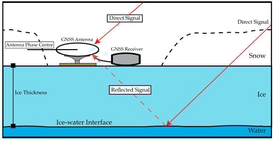 Principle behind the GNSS-IR retrieval approach for the estimation of ice thickness showing the GNSS reflected signal at the ice–water interface.