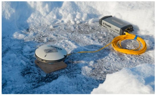 Non-positioning applications of Global Navigation Satellite System (GNSS) are frequently used as a low-cost method in various domains of application (e.g., atmospheric and surface monitoring). GNSS Interferometry Reflectometry (GNSS-IR) is one of the most common remote sensing approaches among non-positioning GNSS applications to measure surface properties, including soil moisture content [8], snow depth [9], and vegetation water content [9]. Although the potential of GNSS-IR for sea ice detection [10] and ice thickness estimation [11,12] has been explored, there has been no direct field application for measurements over ice cover at multiple lake sites.