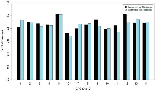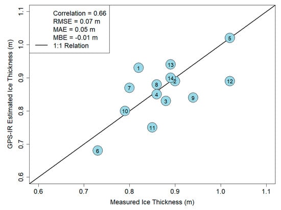Following the retrieval procedure described in Section 2.1, ice thickness was estimated at each of the 14 sites (Figure 5). For all sites combined, the mean absolute error (MAE) is 0.05 m, mean bias error (MBE) is −0.01 m, and the root mean square (RMSE) is 0.07 m. The obtained RMSE from this method is an improvement compared to best estimates of ice thickness from Great Bear and Great Slave Lakes, which showed a RMSE of 0.19 m [6]. The negative MBE indicates slight underestimation of retrieved ice thicknesses overall. The correlation between in-situ measurements and GNSS-IR retrievals is 0.66 (Figure 6), which fits in the range for previous satellite-based estimates at >0.65 [7].