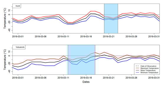 Maximum, minimum, and mean air temperatures recorded at Inuvik (top panel) and Yellowknife (bottom panel) during the 1 January–31 May 2019 period. Shaded boxes correspond to field measurement periods when GPS data and ice thickness measurements were collected.
