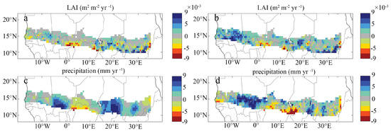 As illustrated in Figure 6 and Table 3, the seasonal variations between LAI3g and MODIS–LAI and between CRU and TRMM precipitation are very similar. MODIS–LAI had a higher positive trend at 1.69 × 10−3 yr−1 than that of LAI3g at 0.38 × 10−3 yr−1 between 2001 and 2016; however, this trend of MODIS–LAI is still less than half of the trend of LAI3g between 1982 and 1999 at 4.25 × 10−3. Meanwhile, the trend of TRMM precipitation was lower than that of CRU records (Table 3), which indicates that the wetting may level off in a stronger way. In addition, the spatial patterns of the changes between these datasets were also generally consistent (Figure 7), although TRMM precipitation has more areas with negative trends in the middle of the Sahel (Figure 7d). This suggests that the results found above could be maintained across different datasets.
