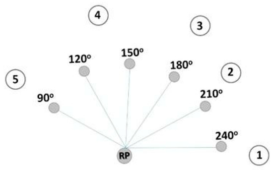 Scheme of the spectro-radiometric measurements (six angles from a reference point “RP”) and soil respiration collars distribution (5 circles) in the cultivated plots.