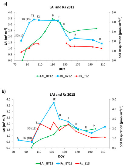 LAI and Rs dynamics are shown for both years in Figure 3a,b. LAI values were higher in 2012 than in 2013 with 3.48 m2m−2 and 1.9 m2m−2 maxima values occurring at the beginning of May (DOY 130) and June (DOY 157), respectively. The minimum occurred at the beginning of the growing season (March). LAI dynamics showed similarities between both growing seasons. Values increased sharply from sowing (S) to booting (B) during vegetative stages. After these vegetative stages, LAI values started to decrease during the reproductive stages until the soft dough development stage (D) or a bit later. Then, LAI values remained relatively constant during the rest of the stages of grain filling until maturity and harvest (H).
