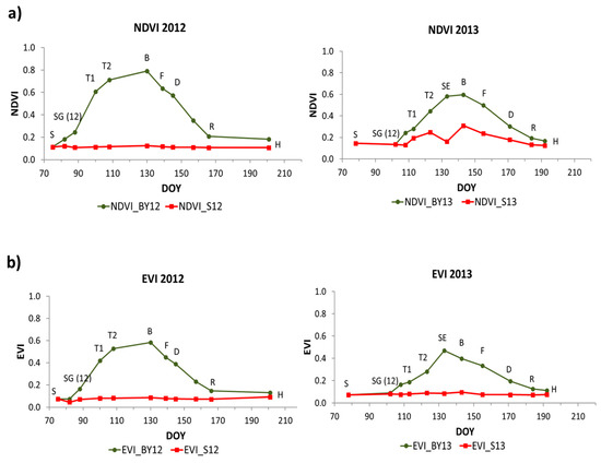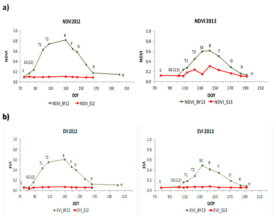 In both years, NDVI, EVI, NDWI and NDWI2 increased notably during the vegetative stages from emergence to booting (B) when they reached their maximum values, except EVI in 2013 which reached its maximum value before booting. Then, values started to decrease during reproductive stages until harvest reaching similar minimum values as in the first stages of barley. In NDWI, values at the end of the growing season were higher than values at the beginning of the growing season. NDVI, EVI, NDWI and NDWI2 in the bare soil plot remained regular all the period in both years with values around 0.1 in NDVI, 0.07 in EVI, −0.15 in NDWI and −0.3 in NDWI2.