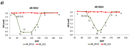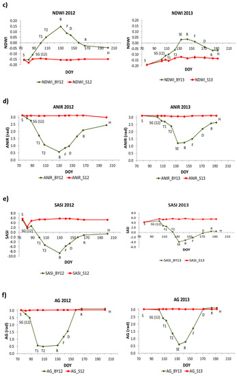 Spectral MODIS indices dynamics: (a) NDVI, (b) EVI, (c) NDWI, (d) ANIR, (e) SASI, (f) AG, (g) AR. Average values for the two barley plots (BY) and measured values for the bare soil plot (S) in 2012 and in 2013 in Madrid, Spain.