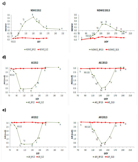 Spectral Sentinel-2 indices dynamics: (a) NDVI, (b) EVI, (c) NDWI2, (d) AG, (e) AR. Average values for the two barley plots (BY) and measured values for the bare soil plot (S) in 2012 and in 2013 in Madrid, Spain.