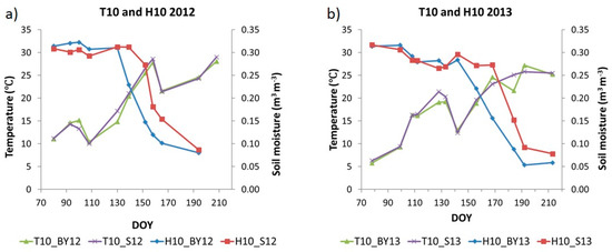 The dynamics of soil temperature (T10) and soil moisture (H10) at 10 cm depth for both years are shown in Figure 6a,b.