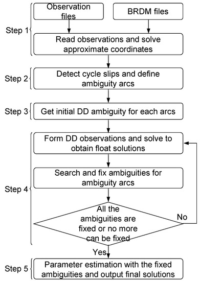 - Form DD observations epoch by epoch, solve the resolution with Kalman filtering (KF) to obtain float solutions, and search and fix ambiguities for ambiguity arcs.
