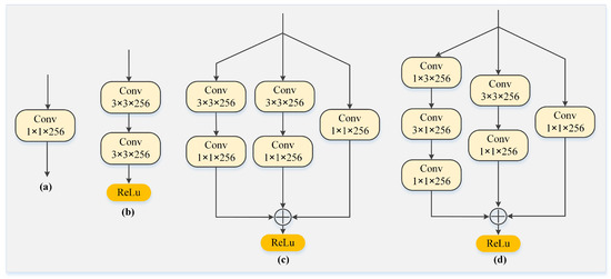 Different multi-scale semantic enhancement blocks. From left to right are (a) M_1 block, (b) M_2 block, (c) M_3 block, and (d) proposed MSEB block.