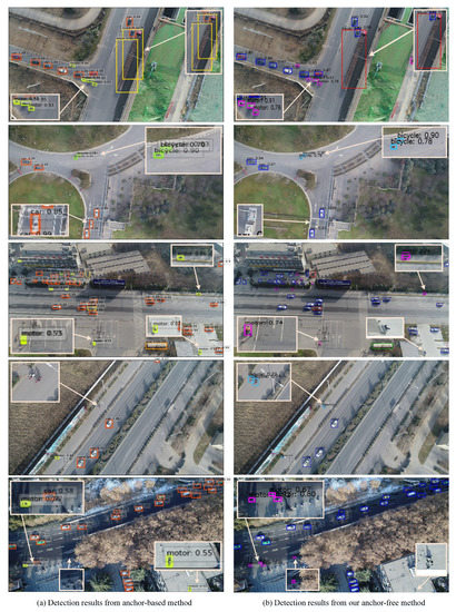 The qualitative comparisons between the anchor-based and the proposed anchor-free methods can be seen in Figure 5. Compared with the anchor-based method [24] (Figure 5a), our anchor-free method (Figure 5b) obviously reduces false positives rate, missed rate, and redundant bounding boxes, etc. We analyze the two main reasons as following: firstly, because the scales and aspect ratios of anchors are fixed for the anchor-based vehicle detectors, even with careful design, it is difficult to deal with object candidates with large scale variations, particularly for small-sized vehicles. Secondly, anchor-based vehicle detectors that only consider the anchor boxes with a highly enough IoU with ground-truth boxes as positive samples, but the anchor-free methods consider the locations falling into any ground-truth boxes as positive samples. Compared with the anchor-based vehicle method, the anchor-free vehicle detector has more positive samples for training to reduce the imbalance between positive and negative samples.