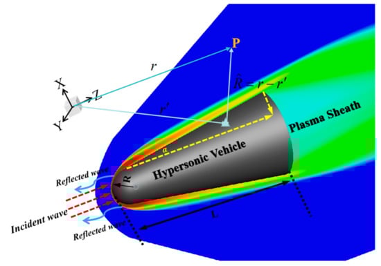 Detection and recognition of hypersonic vehicle by radar remote sensing involves the study of dynamic EM scattering of metal targets combined with the plasma flow field [1,2]; especially without considering the influence of near-space clutter and noise, how to obtain reliable DRCS data of hypersonic target becomes more important. We can get different DRCS data according to different flying states of the target spacecraft and establish a complete classification and recognition database. However, when the aircraft is flying at ultra-high speed in near space, the gas molecules around the vehicle will be excited to ionize, and the outer surface of the vehicle will be covered with a thick layer of plasma, which is called “plasma sheath” in the field of radar remote sensing [3,4]. The plasma sheath absorbs and attenuates the detection radar wave emitted by the SBR, and even makes the EM wave deviate from the original propagation track, resulting in irregular and disordered changes of the scattered signals received by the radar, and thus the main information of the target is lost, which brings great challenges to radar remote sensing, tracking and identifying hypersonic targets [5,6,7,8].