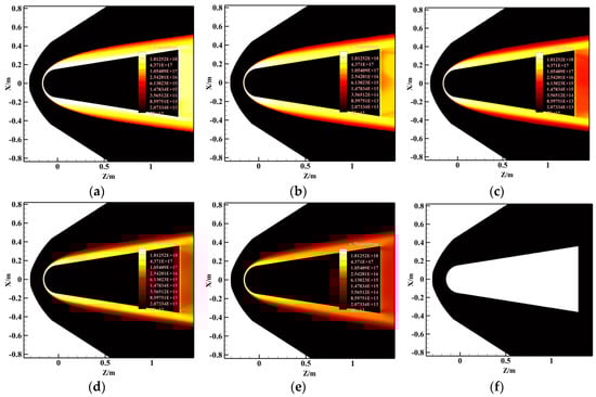 Electron density distribution field of the plasma sheath at: (a) 30 km, 20 Ma; (b) 40 km, 20 Ma; (c) 50 km, 20 Ma; (d) 60 km, 20 Ma; (e) 70 km, 20 Ma; and (f) 0 km, 0 Ma.