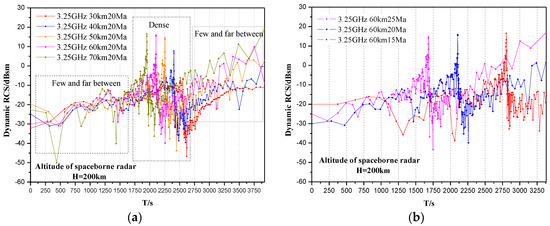 The numerical distribution and fluctuation change of the dynamic RCS curve are related to the flying altitude and flying speed. According to the flying path and the relative position of the space-borne radar and hypersonic vehicle, it can be concluded that, as shown in Figure 5a, the higher is the flying altitude , that is, the closer is the hypersonic vehicle to the space-borne radar, the shorter is the time required for the radar to sweep through the fuselage unit angle at the same flying Mach number . In other words, the faster does the dynamic RCS fluctuation of the target spacecraft change in the same time range, the shorter is the time for the curve to change from sparse to dense and then to sparse.