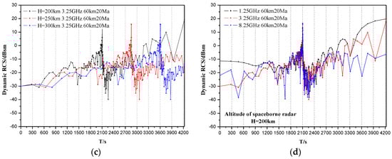 In this section, the space-borne radar is located on a non-synchronous satellite at a height of 200–300 km, and the EM wave bands irradiated by the detection radar are the L–X bands. We studied the effects of incident EM wave frequency, space-borne radar detection altitude, flying altitude and flying speed of the target spacecraft on the dynamic RCS time series of a hypersonic vehicle covered with a plasma sheath when the range of the angle between the target spacecraft and the radar irradiation direction is . Our objective was to establish a relatively complete dynamic RCS target recognition database for hypersonic vehicle of low-resolution radar. The simulation results are shown in Figure 5a–d.
