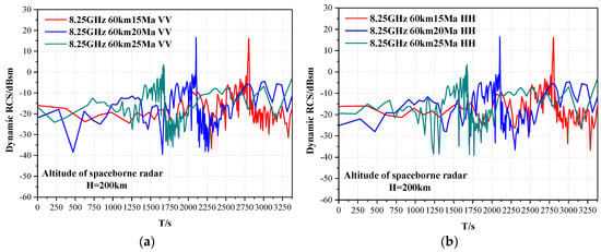 Finally, we calculated the frequency of incident EM wave as ; the incident electric field and scattering electric field are in the same polarizations mode (VV/HH), keep the same flying altitude (60 km) and at the different flying speeds. The DRCS time series of hypersonic vehicle are shown in Figure 6a,b (where the detection altitude of space-borne radar remains unchanged, ).