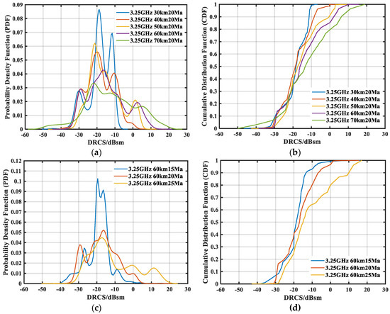 Figure 7a–d shows that the PDF and CDF curve distribution of the DRCS time series of hypersonic vehicle is extremely sensitive to the change of flying altitude and flying speed. The most important ones are the broadening of PDF curve and the change of probability peak (Figure 7a,c). In general, in the same detection period of space-borne radar (SBR), when the flying speed remains constant (20 Ma), the higher is the altitude of hypersonic vehicle, the more obvious is the broadening of PDF curve of DRCS, and the peak height of probability density is lower. This is because the higher is the flying altitude, the shorter is the relative distance between the target spacecraft and the SBR. In the same radar detection time range, the illuminate angle range of the radar scanning the hypersonic target is larger, and the distribution range of DRCS coefficient in the range becomes wider; accordingly, the peak value of DRCS coefficient distribution probability is lower. Similarly, at the same flying altitude (60 km), the larger is the flying Mach number, the greater is the broadening degree of PDF curve and the lower is the peak probability density, and the principle are the same.