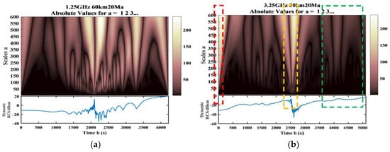 Because the fluctuation change recorded by the wavelet function is 0 by default at the initial position, the initial value of the target dynamic RCS curve is less than 0. For example, in Figure 8b, the value of the dynamic RCS curve of the target spacecraft at the initial position is −32 dBm; hence, the wavelet transform determines by default that the initial position of the dynamic RCS sequence of the target suddenly changes. In other words, it is shown in the time-scale diagram that relatively bright longitudinal stripes will appear in the initial time period, as shown in the area enclosed by a red dashed line in Figure 8b.
