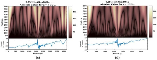To enable the final results to be compared for different flying states of the target spacecraft, during the flying process, the range of angle variation with which the space-borne radar illuminates the target spacecraft was always ; thus, the total time in of the target spacecraft for different flying states was different. In the simulations, the time interval was , the maximum value of scale factor was and the wavelet (compactly supported wavelets with least asymmetry and highest number of vanishing moments for a given support width) was used as the mother wavelet, where was calculated as 4. As shown in Figure 8a–d, when the flying altitude of spaceborne radar is , for four different flying states and incident EM wave frequencies, the time-scale diagram of dynamic RCS time series of the hypersonic vehicle is obtained after continuous wavelet transform.
