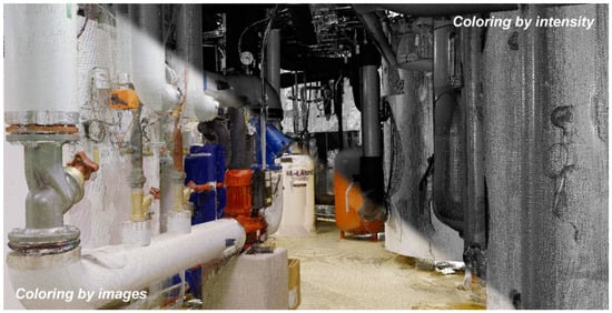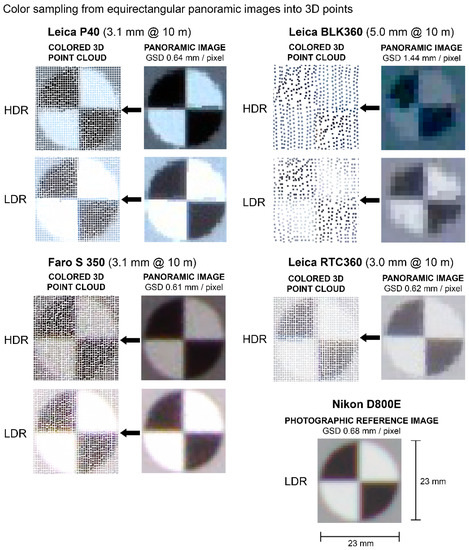 Terrestrial laser scanning (TLS) enables the efficient and detailed collection of 3D point clouds from the real world for a rapidly increasing number of use cases. Three-dimensional point clouds describe the geometry of the targeted object or environment and are either applied directly, or used as a starting point for further processing, modeling, or analysis. In addition to geometry, non-geometric information such as radiometric information about the target is highly relevant and required by many applications. For example, laser scanners usually record the point intensity values and can utilize cameras to derive color values for the 3D point clouds. Color information (most commonly red, green, and blue values of the RGB color model) can be considered as one of the most common, useful, and important types of non-geometric information and typically comprises the radiance captured by an imaging sensor as an integrated part of the 3D measuring system or as a separate external camera. This radiance is affected e.g., by illumination, geometry, and diffuse and specular reflectivity of the target (e.g., [1,2]). In itself, the color values of a point cloud do not only describe the colorfulness but the differences in luminance and in color (i.e., contrast) that are then visually perceived as details in the scene. Reliable and accurate color information is crucial in numerous applications that rely on visually interpreting and understanding the data, such as in visually recognizing objects (e.g., color-coded standard pipes in industrial facilities [3]) or their material properties. Color is essential in photorealistic applications that rely on textured 3D models or colored point clouds (e.g., [4]), for example in content creation of textured 3D assets for video games industries [5]. The importance of accurate color information has been frequently stressed, e.g., in the cultural heritage and archaeology fields where the visual appearance of a model is a key aspect (e.g., [2,6]). Color information can be also used to improve and automate, e.g., traffic sign recognition [7], construction components [8] and building materials [9], the detection of material defects [10], the reconstruction of building facades [11], and more generally automate various data processing steps such as registration [12,13,14] and segmentation [15,16,17] of 3D point clouds (Figure 1).