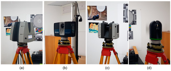 The tested instruments as mounted in the test setting: (a) a Leica ScanStation P40; (b) a Faro Focus S 350; (c) a Leica RTC360; (d) a Leica BLK360.
