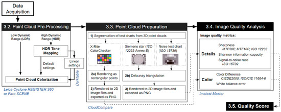 Colorized point cloud data per each tested scanner was prepared using CloudCompare (version 2.10-alpha), which is an open-source 3D point cloud and mesh model processing software package [90]. The goal was to prepare and render comparable 2D image files from colorized 3D point cloud data for each test chart for further image quality analysis. This data preparation workflow (illustrated in Figure 4) was as follows: