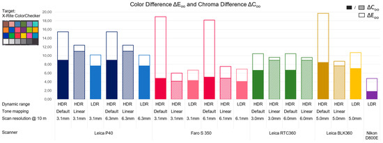 To quantify the total color accuracy, the mean values of absolute color difference (ΔE00) for each scan are presented in Figure 5, below. Additionally, to assess the color accuracy with the minimum effect of luminance, the mean chroma difference (ΔC00) was calculated for each scan. The color and chroma differences were calculated using the CIEDE2000 formulas [93]. For all of the tested scanners, the total color difference was the largest when using HDR mode with default tone mapping settings. The HDR scans acquired with the Leica RTC360 produced the smallest error when using these default settings. The results from the Faro S 350 were closest to the ColorChecker reference when the linear tone mapping settings were used or no HDR mode was used at all. As expected, the scan resolution setting did not show any significant effect on the color difference. For the chroma difference, using LDR produced generally more accurate chroma than using HDR. Of all tested scans, the Faro S 350 produced the smallest error while the Leica P40 had the largest differences in chroma values.