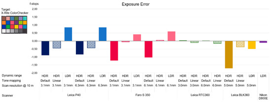 The measured exposure errors per scan are presented in Figure 6. The f-stop is the ratio between the focal length of the camera lens and the diameter of the entrance pupil. The HDR scans with default settings appeared to suffer from underexposure, except for the Leica RTC360 that produced the most accurate exposure. All the LDR scans suffered from overexposure, except the one collected with the Leica BLK360.