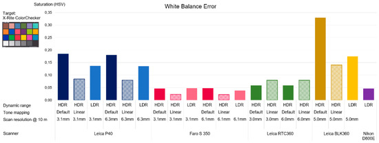 The measured mean white balance errors per scan are presented in Figure 7. The HDR scan with default tone mapping settings scanned with the Leica BLK360 clearly has the largest white balance error, while the Faro S 350 had the most accurate white balance.