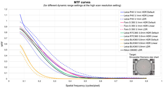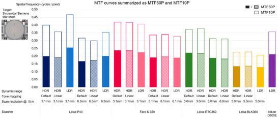 As a metric for system sharpness, MTF curves were measured from the sinusoidal Siemens star charts. As expected, the results (see Figure 10) showed a clear increase in sharpness when the scan resolution was increased. While the differences between the tested dynamic range settings were not so self-evident. The mean MTF curves for each scan for all the compared dynamic range settings are presented in Figure 9. When using LDR the Leica P40 produced the sharpest result of all compared scans with a noticeable improvement in sharpness compared to the HDR scans. As expected, using HDR with the linear dynamic range settings appeared to reduce the sharpness with all scanners. Overall, the Leica BLK360 clearly produced the least sharp results at all tested settings.