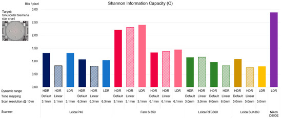 Numerous image quality studies have focused on testing digital cameras in general (e.g., [59,60]), or on more specific types of devices and systems such as camera phones (e.g., [61,62]), 360-degree cameras (e.g., [63,64]), and digital aerial imaging sensors (e.g., [65,66,67]). However, the authors have been unable to identify any studies concerning the imaging quality of TLS systems with integrated cameras.