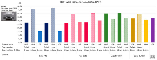 The selected quality metrics related to system sharpness and information capacity were measured from colorized 3D scans of the Siemens star chart. To estimate the level of noise in the colored point clouds, the signal-to-noise ratio according to ISO 15739 was measured from colorized 3D scans of the simplified ISO 15739 noise test chart for each scan. A summary of the results is presented in Table A3 in the appendices and for visual reference, the analyzed Siemens star charts and the simplified ISO 15739 noise test charts per scan segmented from colorized 3D point clouds with high-resolution settings (the closest to 3 mm @ 10 m) are listed in Table A4 and Table A5 in the appendices.