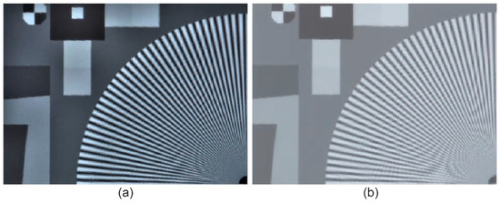 The sinusoidally modulated Siemens star [73] chart (Figure 3b) was used to assess quality factors related to detail reproduction such as image sharpness. The Siemens star chart (size of 50.0 × 66.7 cm) consists of 144 pattern bands and is included in the ISO 12233:2017 [74] standard (Annex E). Measuring sharpness via resolution measurements using the sinusoidal Siemens star is considered a reliable approach for all cameras and is less susceptible to image processing (e.g., sharpening) compared to methods that rely on high contrast edges. Furthermore, it allows measuring sharpness from multiple angles at a time [73].