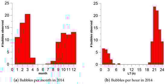 - Magdaleno, S.; Herraiz, M.; Altadill, D.; Benito, A. Climatology characterization of equatorial plasma bubbles using GPS data. J. Space Weather Space Clim. 2017, 7, A3. [Google Scholar] [CrossRef]