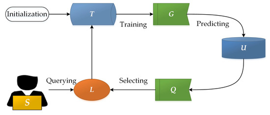 The key hypothesis of active learning is that if the learning algorithm is allowed to choose the data from which it learns to be “curious”, it will perform well with less training [28]. An active learning model includes a supervised predictive model (G), a training sample set (T), a query function (Q), an unlabeled sample set (U), a supervisor (S), and a queried sample set (L).