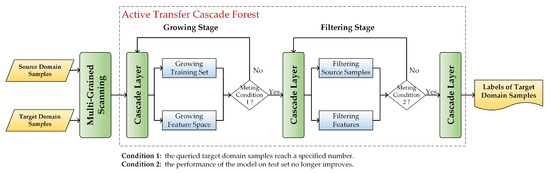 and are then input into the active transfer cascade forest, which consists of a growing stage and a filtering stage. In the growing stage, the performance of the model is gradually improved by updating the training set using active learning and adjusting the feature space using the augmented features. In the filtering stage, the performance is further improved by iterative processing until the model converges. At the same time, to accelerate the convergence of the model, two filtering strategies are used to remove the feature subspaces that are less helpful for the knowledge transfer and the source domain samples that do not fit with the distribution of the target domain samples. The class labels of are output from the final cascade layer. The growing stage and filtering stage are described in detail below.