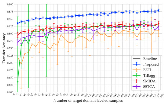 Figure 13 shows the results of the first set of experiments. Overall, except for SSTCA, the transfer accuracies of the other methods improved with the increase of the number of samples. BETL and TrBagg are more unstable than the other methods due to their high sensitivity to the quality of the samples. The accuracy of SMIDA was high when the number of samples was small, and the accuracy curve was stable with the increase of the number of . The proposed method also achieved a high accuracy, and was as stable as SMIDA. On the other hand, the accuracy of SSTCA decreased from 81.63% to 77.6% when the size of exceeded 60.