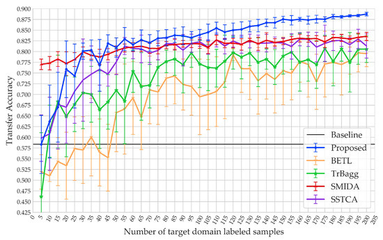 With the increase of the number of samples, the accuracy curves of BETL, TrBagg, SMIDA, and SSTCA tended to approach the maximum faster than in the first set of experiments. The reason for this is that the lower the distribution difference, the fewer samples are needed to supplement the lack of knowledge of . That is to say, in this set of experiments, the newly added samples were more likely to be redundant samples (that are unhelpful for improving the transfer accuracy) when there are already many samples in the training set.
