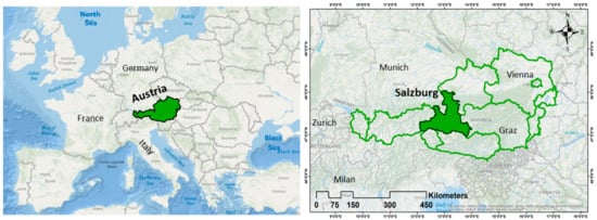 Austria is an alpine country enclosed by land and situated in Europe with an approximate area around 84,000 km2 having 8.7 million population [52]. Owing to the setting of the country in the alpine range and having climatic environment, natural hazards like landslides, avalanches, and floods pose a significant risk to the low-lying areas within the country. More than 1 million habitants residing and 13% of the structures are situated in flood-prone regions of Austria [53]. In 2002, 2005, 2006, and 2013, large scale flooding occurred along the Danube and its tributaries in Austria [54]. The State of Salzburg is one of the nine federal states in Austria, and Salzburg is the capital of the state of Salzburg. The region has been impacted by severe flooding and landslides in recent times, and the region is very dynamic concerning its economic and growths [55].