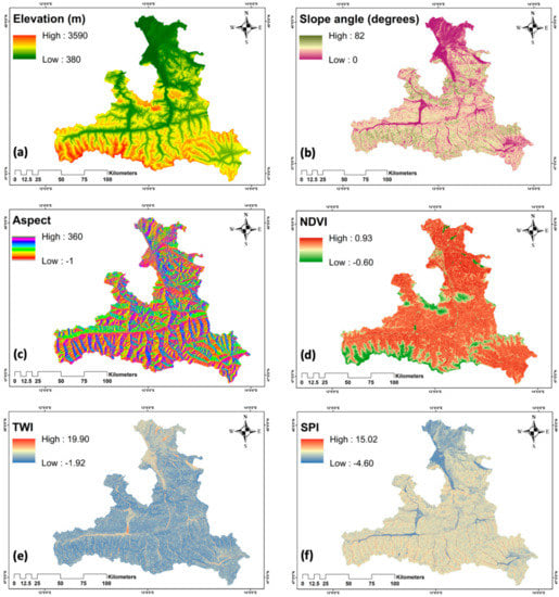 Elevation plays an important influence on flood and landslide exposure mapping [23]. The elevation describes the deepest and the maximum range point in the region. The elevation influences the geomorphological and geological processes [63]. It can affect the topographic attributes that lead to spatial variability of different landscape processes, and it can influence the vegetation distribution. As the elevation ascents in the Alpine region, vegetation fluctuates are witnessed.