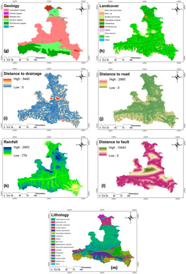 Influencing factors for landslides and floods used in this study: (a) elevation (m), (b) slope, (c) aspect, (d) normalized difference vegetation index (NDVI), (e) topographic wetness index (TWI), (f) stream power index (SPI), (g) geology, (h) land cover, (i) distance to drainage (m), (j) distance to road (m), (k) rainfall, (l) distance to fault, and (m) lithology.