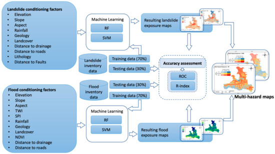 The overall workflow is shown in Figure 4, which shows the influencing factors used for flood and landslide and the ML approaches used for deriving flood and landslide exposure maps.