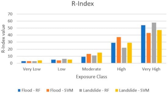 Table 5 displays the r-index for flood and landslide with random forest and support vector machines with the five exposure classes. The r-index illustrates together RF and SVM has the highest values for flood and landslides in the very high exposure class and the lowest in the very low exposure class, as shown in Figure 9.