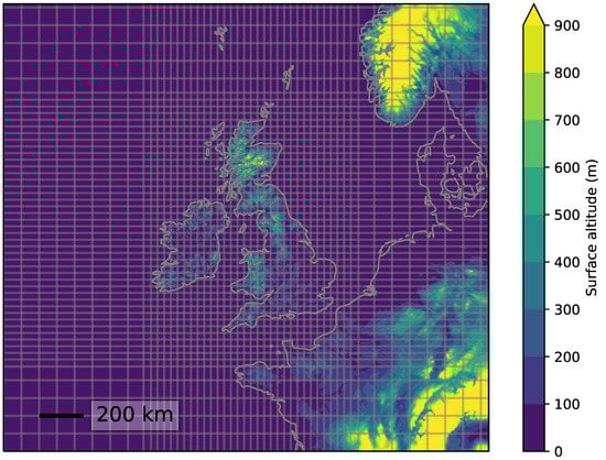 The NWP model used in this study is a high-resolution limited area configuration of the UM, using version 2 of the midlatitude regional atmosphere and land settings (RAL2-M). Version 1 of this configuration has been described previously [19]. The changes for version 2 relate to the treatment of surface snow, surface exchange, boundary layer physics and cloud microphysics in mixed phase clouds as well as a unification of the vertical level set between the midlatitude and tropical configurations. The model uses a variable-resolution horizontal grid centred over the United Kingdom (Figure 1), with a grid spacing in the central region of 1.5 km. Note that some of the flights used in this study extend to the outer region of the grid, which has a coarser 4 km resolution. The model has 90 vertical levels on a hybrid-height grid, extending from the surface to a height of 40 km, and is initialised using the analysis from the operational deterministic UKV forecast [20] closest in time to the flight. The model timestep is 1 min, and atmospheric and surface fields are output every 15 min. For the simulations presented in this study, the fields closest in time to the mid-point of the observations are used. This gives a maximum time difference between observations and model fields of 32 min.