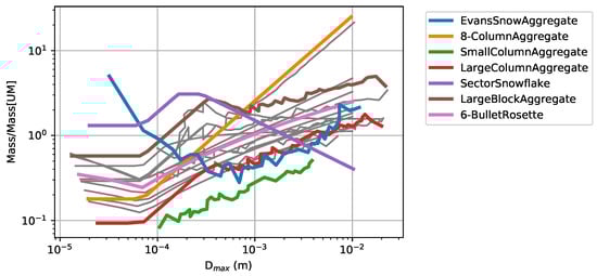 where the exponent is chosen based on theoretical considerations for aggregating particles [27]. For this choice of exponent, is directly proportional to the ice mass. However, none of the particles in the ARTS database follow this mass–dimension relationship exactly, as shown in Figure 2, which shows the ratio of the ARTS database particle masses to the mass calculated using (6) for habits that may be representative of cloud ice. Habits designed to represent hail and graupel are ignored, as are any habits with a mass–dimension relationship exponent of 3, since these are unlikely to be representative of larger aggregated particles. An exception is the “8-ColumnAggregate” shape, originally defined by [28], which is included as it has been used in previous studies, including for cloud ice retrieval from sub-millimetre observations [11]. The differences in mass–dimension relationships between the ARTS database and the NWP model mean that it is not possible to match exactly both the size distribution and the ice mass concentration between the NWP and radiative transfer models using single habits from the ARTS database. Instead, the F07 tropical parametrization is used in the radiative transfer model, but the individual mass–dimension relationships of the ARTS database habits are applied. This ensures that the bulk mass remains consistent with the NWP model.