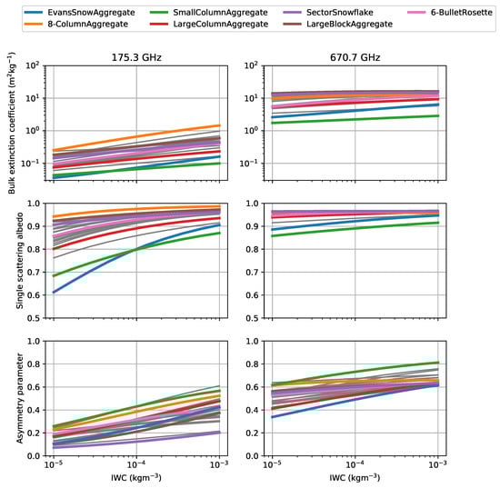 Even with the restrictions on possible cloud ice habits described above, it is still not practical to perform simulations for all remaining habits. A subset of habits was identified according to the bulk optical properties, which have been calculated by integrating the single scattering properties over the F07 tropical PSD for a range of ice water content values. Figure 3 shows bulk extinction coefficients, single scattering albedos and asymmetry parameters at 175.3 and 670.7 GHz and a temperature of 230 K. A range of particle habits has been selected that covers the range of bulk optical properties, and these particles are indicated by the coloured lines. Note that the SectorSnowflake habit, which was found by [13] to give good results at frequencies between 10 and 183 GHz, is included in the selected habits. For the selected habits, the mass-weighted mean size (assuming the F07 tropical PSD) ranges between approximately 60% and 200% of that derived using (6) for ice water contents between and kg m and temperatures between 223 and 263 K.