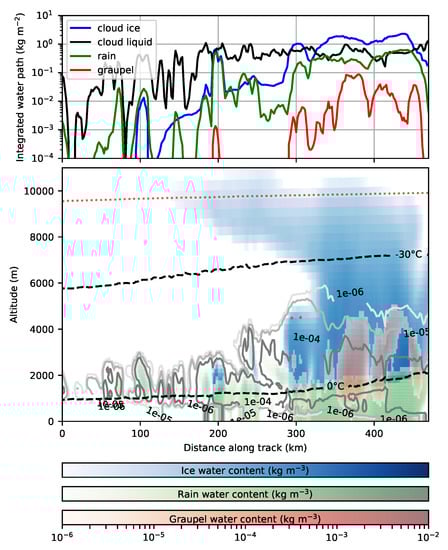 NWP model integrated water path (top) and hydrometeor mass content (bottom) along aircraft track for flight C161. The solid contours in the bottom panel represent the cloud liquid water content, the dashed black lines show the 0 and −30 °C isotherms and the dotted red line indicates the aircraft altitude.